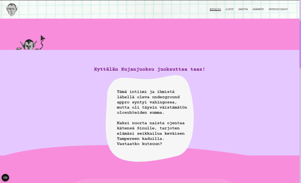 ”Kujanjuoksun sivuja suunniteltaessa otettiin inspiraatiota meidän kirkassävyisistä kartoista. JeleTele Design toi meidän vision henkiin ja lopputuloksena on täydellisen kujanjuoksuiset sivut. Kiitos!” – Saima Herrala